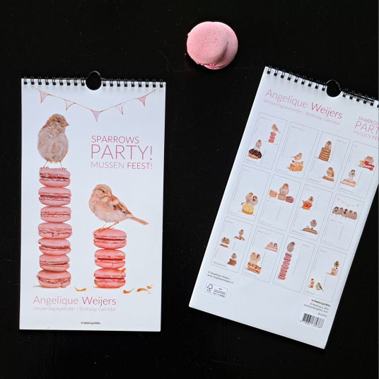 Een kalender vol met feestelijke mussen op ambachtelijk gemaakte taartjes.